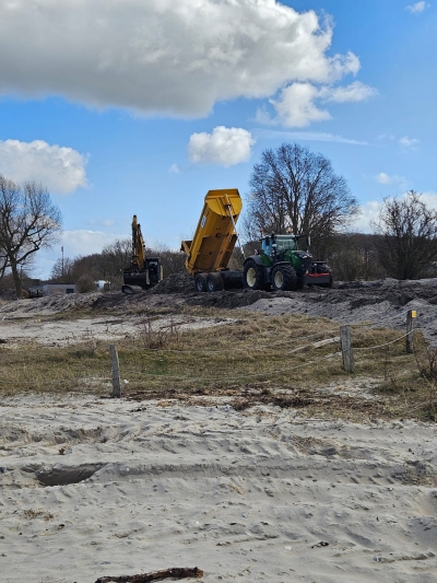 Im zweiten Schritt sollte das Seegras zu einem anderen Strand umgefahren werden. Dort bauen wir für den Küstenschutz aus dem geborgenen, natürlichen Schwemmgut und Seegras ein neues Naturschutzgebiet mit typischen Dünen.