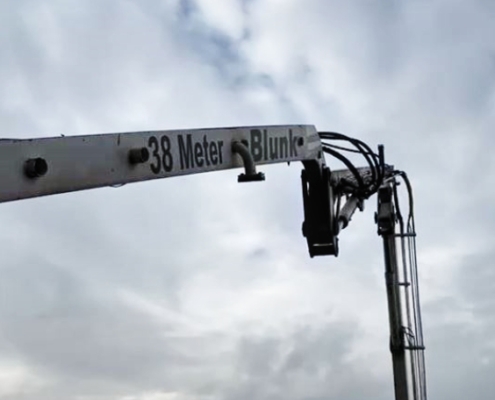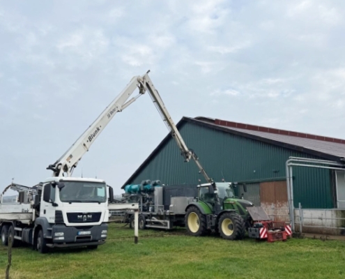 Bei zu dicker bzw. fester Gülle und generell verkrusteten Schwimm- und Sinkschichten hilft Aufrühren. Durch das Aufrühren wird die Masse verflüssigt und wieder pumpfähig. Für diesen Vorgang setzen wir standardmäßig unseren schlagkräftigen Rührer mit 38 Meter Rührarm ein. Dieser Teil des Problems ließ sich also mit unserer Spezialtechnik lösen.